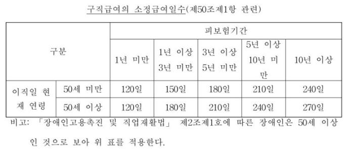 만약, 피보험단위기간이 180일 이상이고 비자발적으로 이직하여 구직급여 수급요건을 충족한다면, 이제 그 근로자에게 얼마 동안 구직급여를 지급하느냐는 피보험기간 및 연령에 따른 소정급여일수에 의해 결정됩니다. 즉, 피보험기간은 고용보험가입기간으로서 취득일부터 상실일 전까지의 기간을 말하며, 이직 당시 피보험기간 및 연령에 따라 다음과 같이 소정급여일수만큼 구직급여를 수급할 수 있습니다. 이 점 참고하시기 바랍니다.