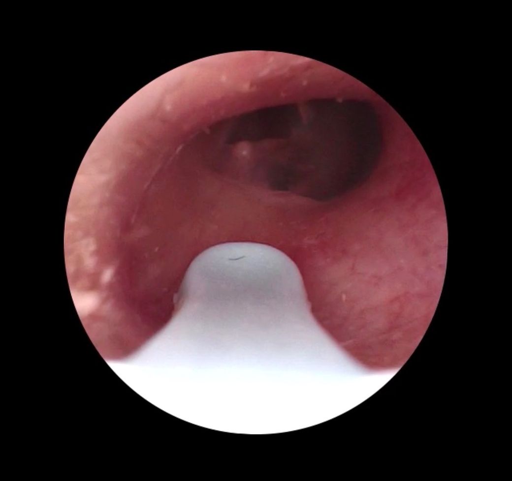 사진에서 보이는 구조는 고막 자체라기보다는 외이도 깊은 부분에 고막이 비스듬히 보이는 장면으로 보입니다. 중앙 상부에 보이는 어둡게 보이는 부분은 고막의 얇은 부위(pars flaccida)나 빛 반사, 또는 촬영 각도에 따른 음영일 가능성이 있습니다. 사진 한 장만으로는 고막 천공(tympanic membrane perforation)을 확정하기는 어렵지만, 전형적인 천공처럼 고막 전체를 관통하는 뚜렷한 결손 형태로 보이지는 않습니다.