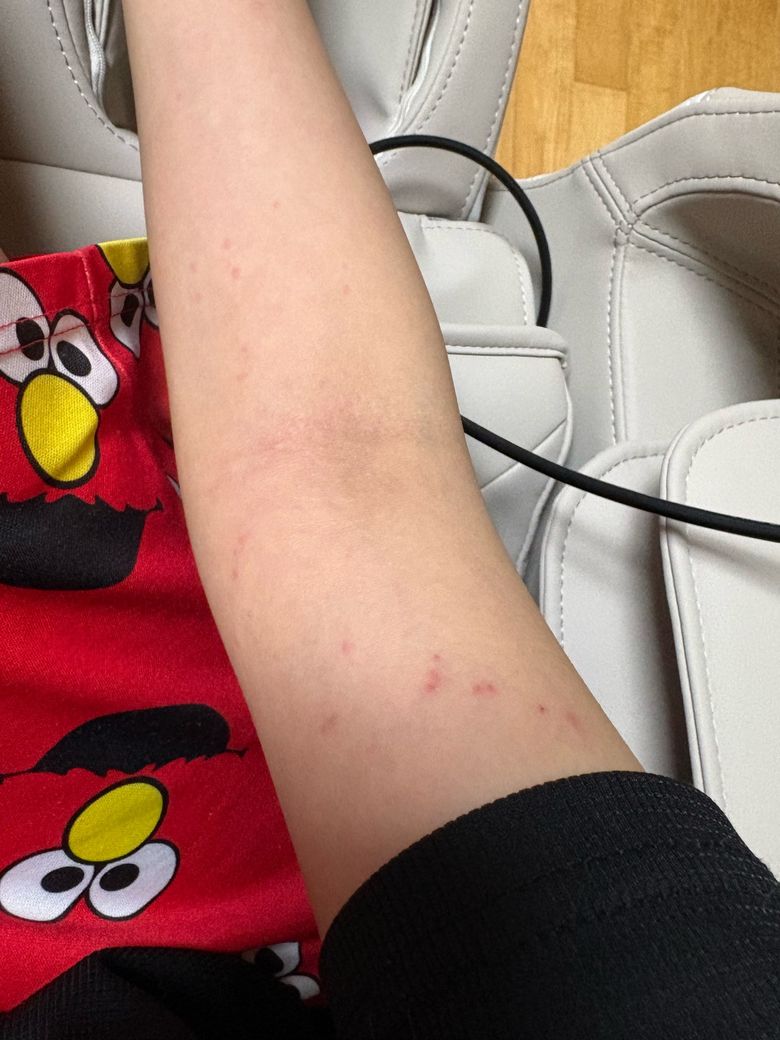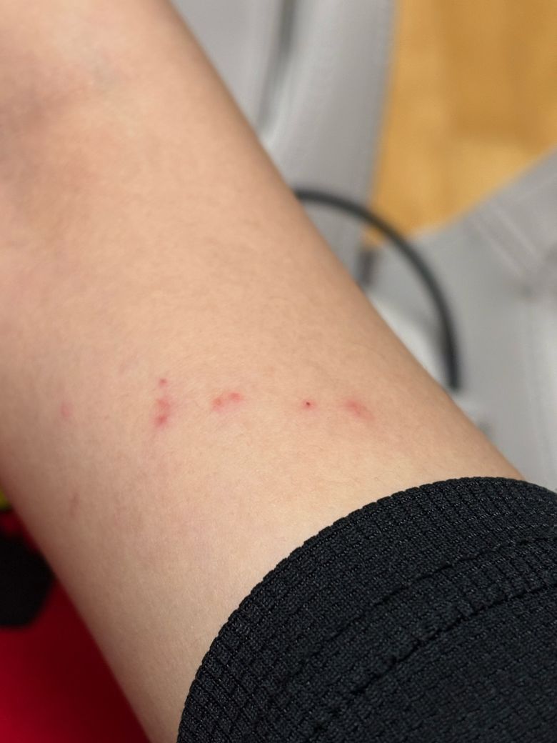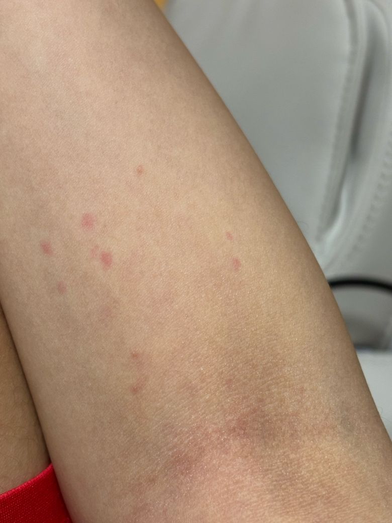 사진을 보면 팔 안쪽과 상완부에 걸쳐 산재한 붉은 구진들이 관찰되며, 일부는 선상(linear) 또는 군집 배열을 보이고 있습니다. 이 패턴은 베드버그(bed bug, Cimex lectularius) 교상의 전형적인 양상과 상당히 일치합니다. 베드버그는 수면 중 노출된 피부를 따라 이동하며 연속적 또는 군집성으로 물기 때문에 이른바 "아침 식사, 점심, 저녁(breakfast, lunch, dinner)" 패턴이라 불리는 일렬 배열이 나타나는 경우가 많습니다.