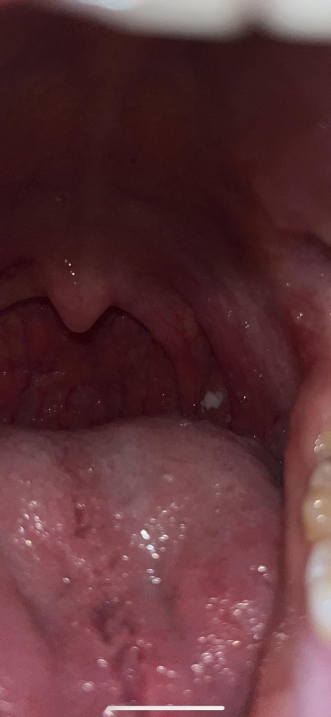 사진으로 관찰되는 병변은 편도결석이나 편도염으로 인한 염증으로 보입니다. 이비인후과 진료를 보고 치료결정을 하는것이 좋겠습니다.
