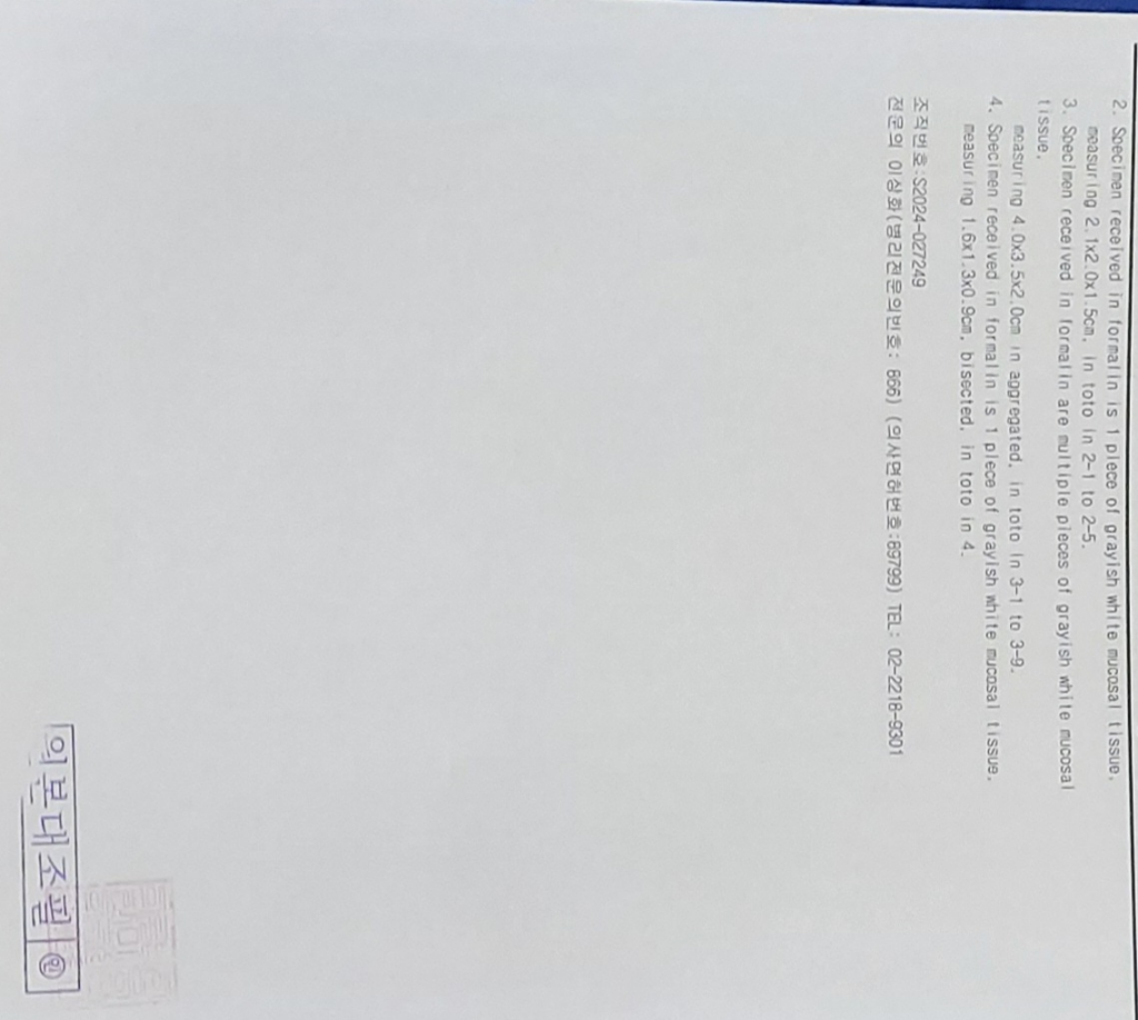 크기는 1.0cm 0.8cm 이었고 종양은 점막에만 있었으며(= 제자리암종, D010)