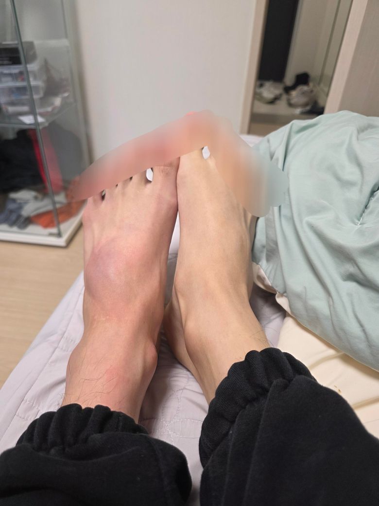 왼쪽 발등이 많이 부어 있고, 붉은 기운도 보이는 것 같습니다.