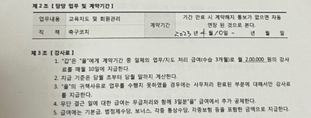 올려주신 일부의 계약서를 볼때 근로계약서가 아닐 수 있을 것으로 보입니다. 강사로서 용역게약을 체결한 경우 근로기준법 적용이 되지 않을 수 있으니 확인하시고 대응하시기 바랍니다.