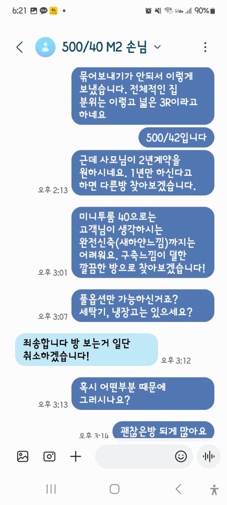 의뢰인마다 성향이 다르기 떄문에 위 문자상황만 보고 판단을 하기는 어렵습니다. 다만 해당 매물 조건이 의뢰인이 생각한 계약기간과 맞지 않아 조정이 어렵기에 판단하고 다른 매물에 대해서는 크게 보고 싶지 않아서 임장을 거부한 것일수도 있고, 인터넷상 다른 매물이 마음에 들어 해당 매물을 먼저보고자 대체 매물 보는것을 보류한 것일수도 있습니다. 그외 확률은 적지만 정작 본인이 보고싶어 한 매물은 보지 못하는 상황에서 대체매물을 먼저 제시한 부분에 대해서 허위매물등으로 판단하여 질문자님의 중개를 받지 않으려고 하는 것일수도 있구요, 일단 지역에 따라서 시세차이가 있기 때문에 판단기준을 두기 어렵지만 500/40기준으로 사진에서 본 매물자체는 내부 상태등은 양호하다 생각은 듭니다.