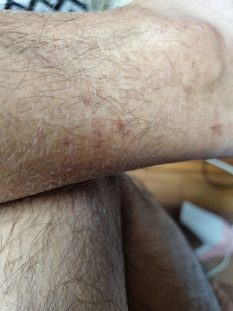 피붖다리에 그리고 손등에 이런 딱지비슷한게 올라오기시작하는데 멀까요ㅜㅜ 무섭습니다봐주세요