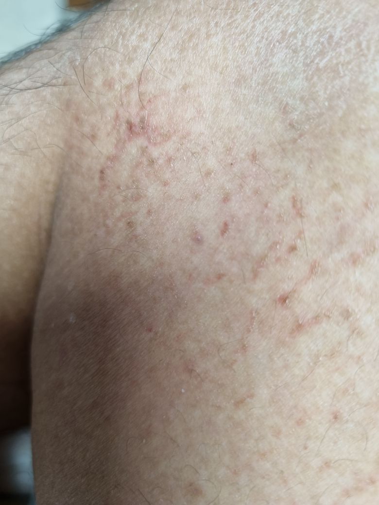 알레르기 건선이나 완선의 가능성이 높은 것으로 보이며 알레르기가 조절 되지 않는 경우,