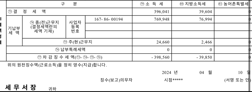 맨 하단의 차가감 세액을 반드시 환급받으셔야 합니다. 따라서 요청을 하시고 환급해주지 않을 경우, 노동청에 신고를 하시면 됩니다.