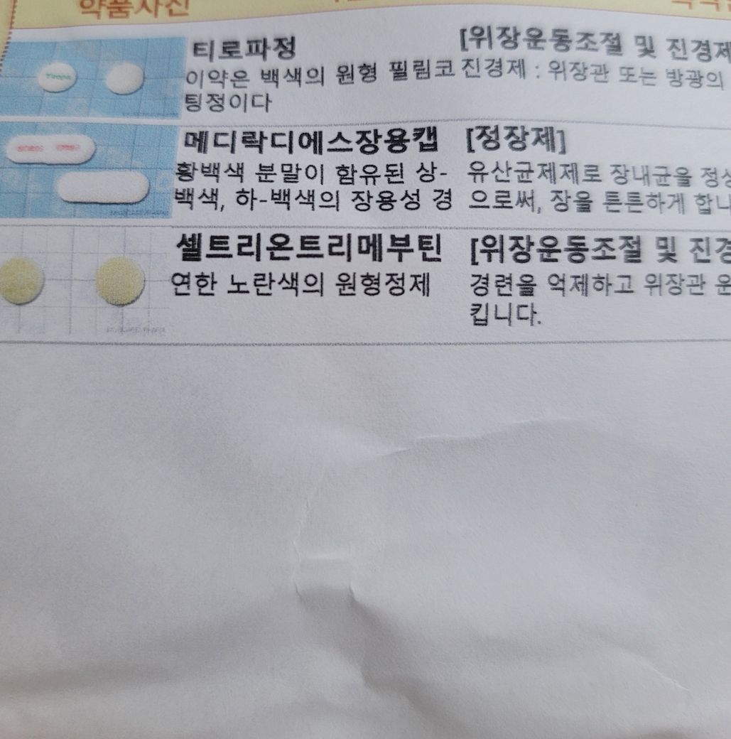 2. 우선 티로파정 정도 빼고 트리메부틴이랑 메디락디에스 드셔보시고, 증상 계속되면 다시 병원 방문해야 합니다.