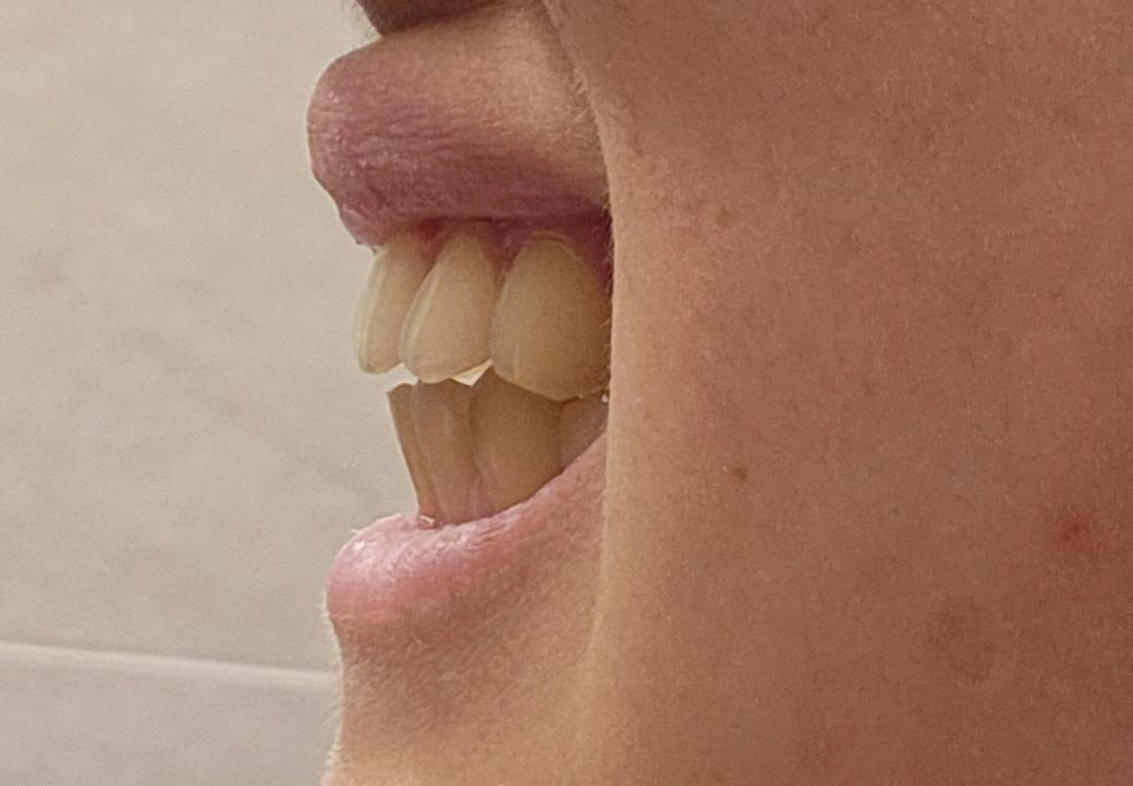 사진으로 봤을 경우에는 교합이 제대로 형성되어 있지 않은 것으로 보입니다. 개방교합의 경우 어금니쪽만 교합이 되게 되어 어금니가 마모가 자주 되거나 턱관절 질환이 생길 수 있습니다.