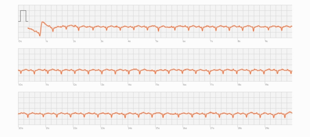 중간중간 리듬이 맞지 않는 부분이 보입니다만 이 리듬이 심실조기수축때문인지는 심전도를 검사해보아야 알 수 있습니다. 검사할 수 있는 내과를 방문해보시는게 좋겠습니다.