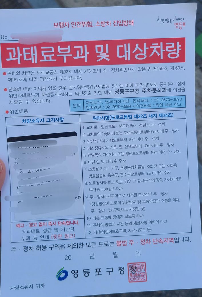 불법주차되어 신고를 했더니 잠시후에 단속반이 와서 과태료부과한다는 내용의 쪽지를 차량유리에 놓고 갔어요