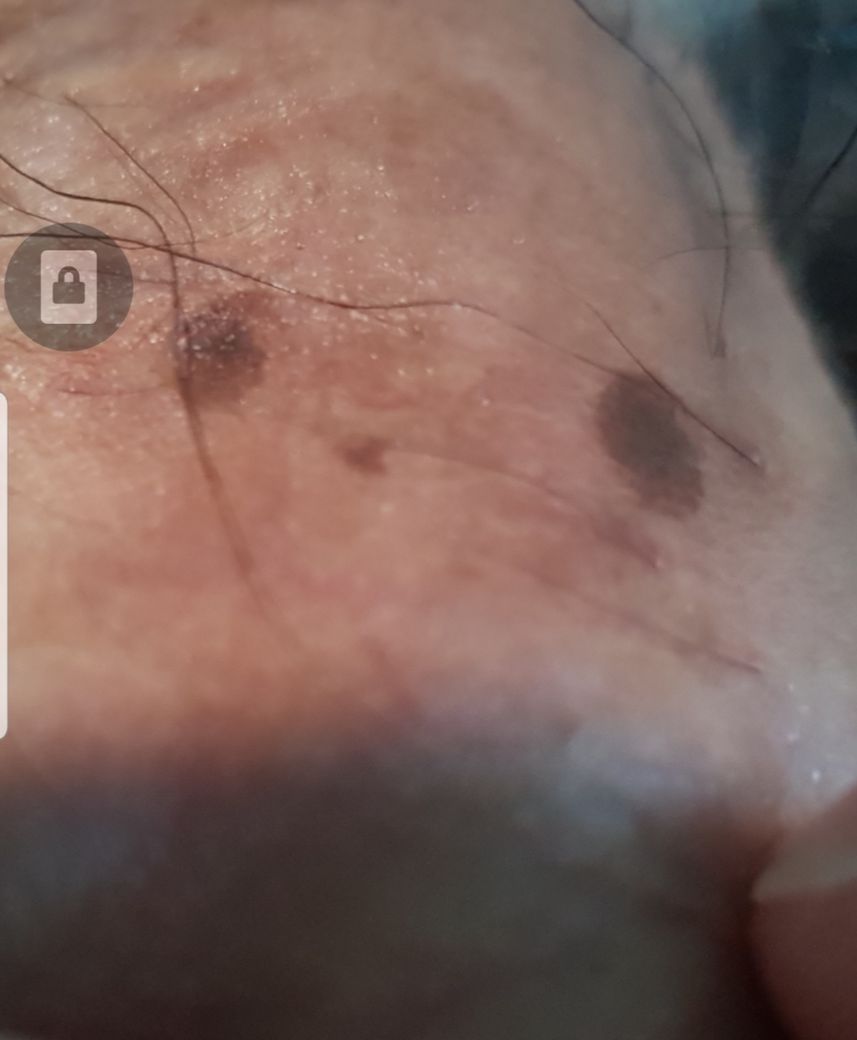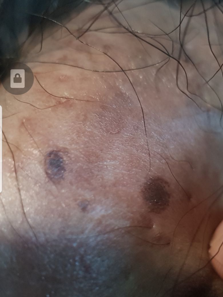 사진의 병변은 단순한 점으로 추정되고 곤지름의 모양새와는 다릅니다. 병원을 방문하실 예정이라 하시니 진료받아보시기 바랍니다.