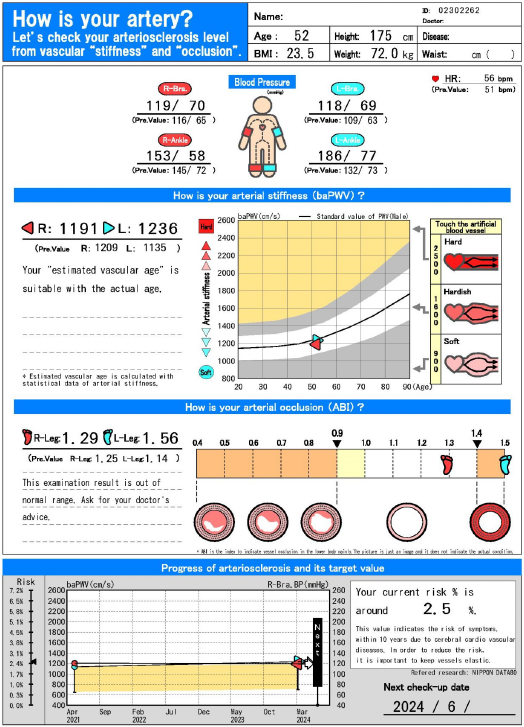 위험도 평가: 검사 결과 하단에 나타난 그래프는 현재의 baPWV 수치가 향후 10년 동안 뇌혈관 질환 발생 위험을 2.5%로 예측하고 있습니다. 이는 비교적 낮은 위험도를 나타냅니다.