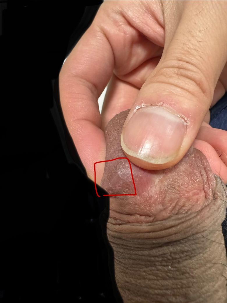 사진에서 표시된 부위는 귀두와 포피 경계 부위에 국한된 얕은 함몰 또는 표면 변화로 보이며, 수포·궤양·딱지 같은 급성 감염성 병변의 전형적인 모습은 아닙니다. 단일 사진만으로 확정 진단은 불가능하지만, 설명하신 경과와 검사 결과를 종합하면 전형적인 성매개 감염 양상과는 다소 거리가 있어 보입니다.