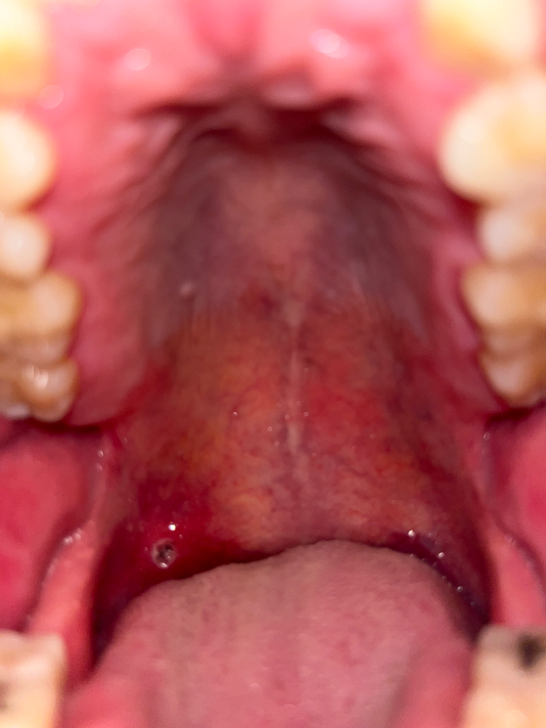 어제 부터 입천장에 구내염의 흰색이 나다. 오늘 알보칠로 치료하였고, 저녁에 약을 바르기 위해 발랐더니 흰색 껍질이 벗겨지면서 현재 사진과 같이 흰색 + 검정반점이 안에 있는데요 ㅠㅠ