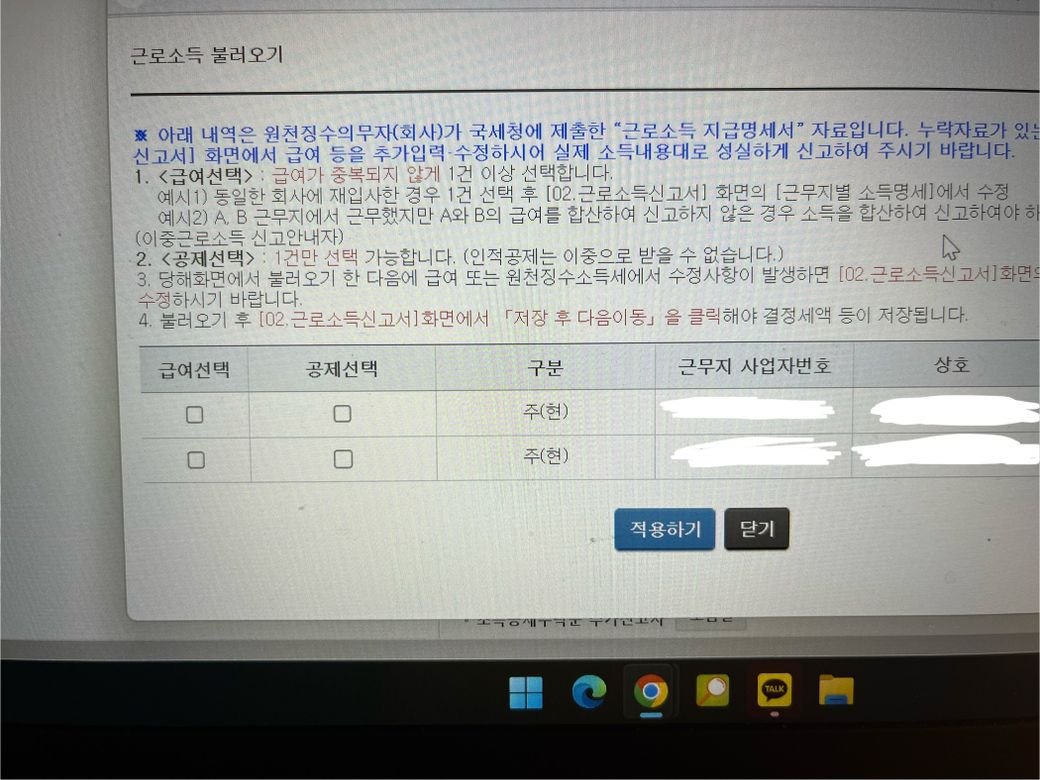 1. 사진에 보이시는 것처럼 직장 두 곳이 나와있는데 급여 선택은 둘 다 하되, 공제선택은 작년 연말정산때 반영하지 않앗던 전직장으로 선택해서 하면될까요? 한 곳만 선택하라고 나와있어서요!