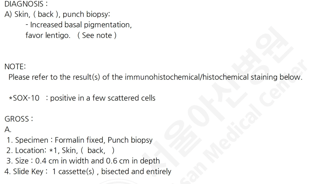 피부 조직 검사를 받으신 것 같습니다. 조직결과 흑색소가 증가 되어 있어 흑색점의 가능성이 생가됩니다. 다만 조직결과지가 일부만 올라와서 나머지 내용도 확인이 필요할 듯 싶네요