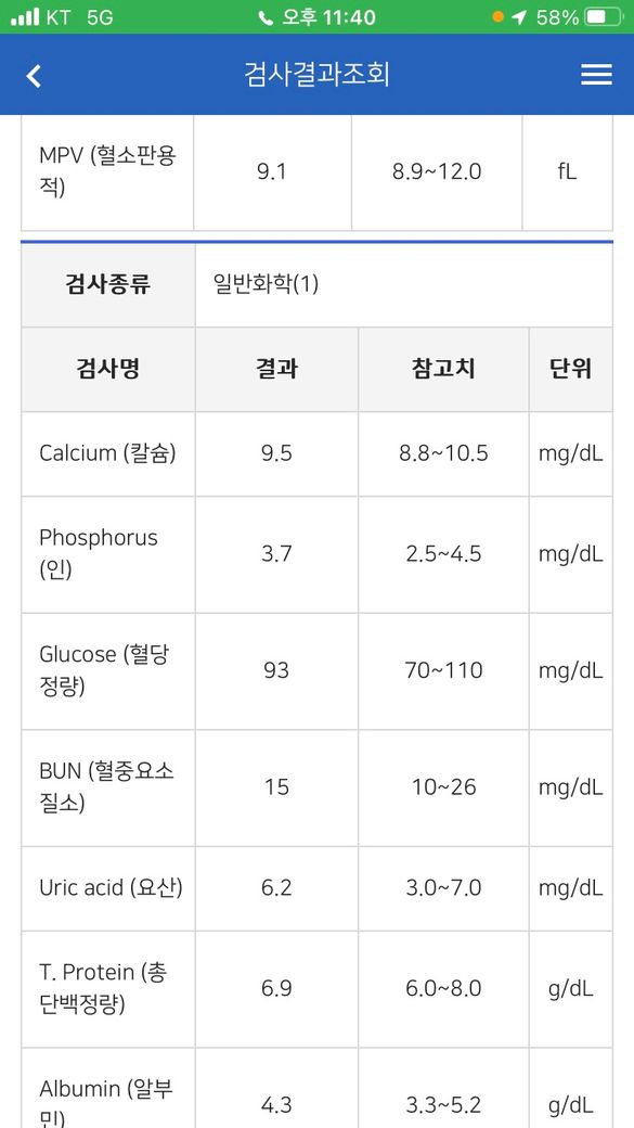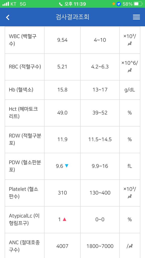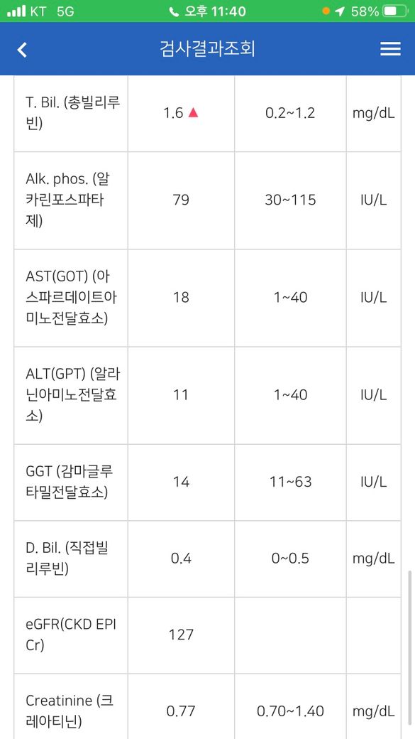 총빌리루빈이 살짝 올라가있지만 걱정할만한 수치는 아니고, 알부민 수치 괜찮고 간수치 정상적인 편이며 혈구들도 정상적입니다. 잘 관리하고 계신 것으로 보입니다.