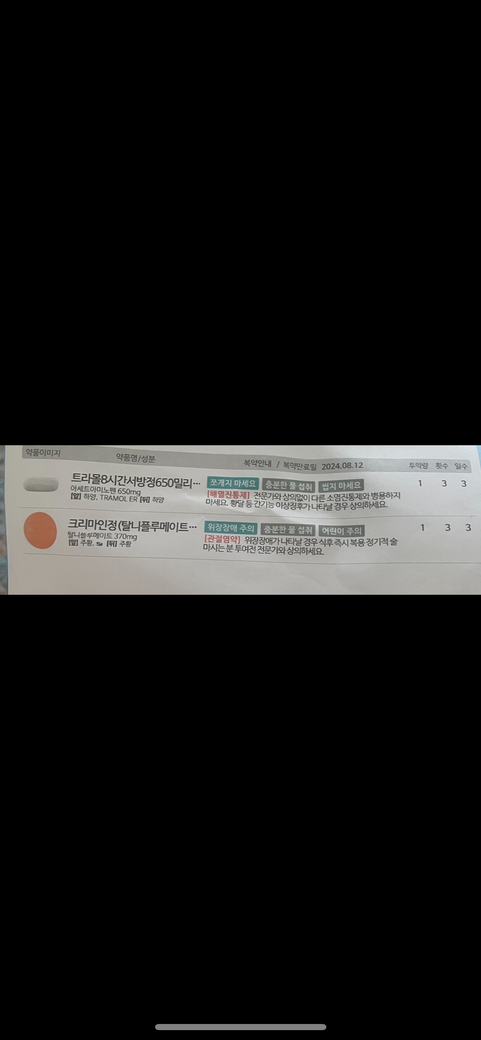 트라몰 8시간 서방정 650mg이랑 크리마인정은 같이 복용을 해도 되며, 1일 3회 복용인 경우에는 최소 4시간 이상 간격으로 4-6시간 간격으로 복용을 하시면 됩니다.