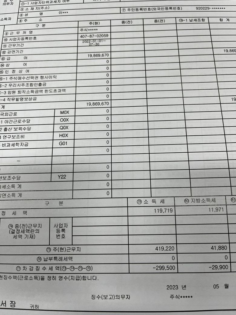 77차감징수 세액 -299,500원 으로 되어있는데 이러면 환급금이 발생했다는건가요? 저는 입금 받은적도 없고 신청한 적도 없습니다 아무래도 전에 일했던 회사가 신청한것같은데 환급받은 계좌를 확인할수있는 방법이 없나요? 전에 회사랑 안좋게 그만두어서 그쪽으로 물어보기가 곤란합니다
