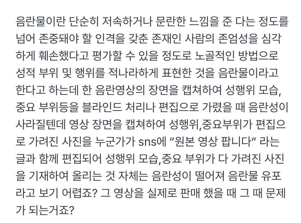 첫번째 사진이 질문,두번째가 답변이고 질문에서 말한 그런 사진을 sns 게시글에 포함해 사진과 함께 판매글 을 게시물로 올렸을 때 그 게시글은 판매를 위해 올린 것이고 실제로 영상을 팔지도 않았다면 음란물 유포죄라 보기 어렵다는 뜻이죠?