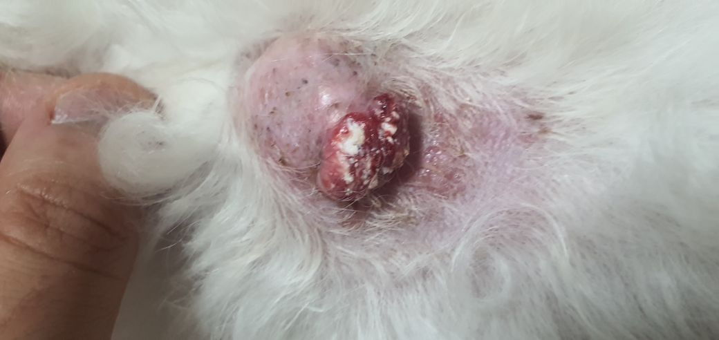 피지일 확률이 높습니다. 동물병원에서 위생적인 환경 하 배농과 필요시 피하의 피막을 제거해야 할 수 있으며, 해당 농이 외부가 아닌 피부 안쪽으로 터지는 등 심할 경우엔 해당 부위를 일부 절개해 한 두 바늘 정도 봉합할 수 있습니다. 사진상으로 보았을 땐 아주 심한 부분은 아닌 것으로 보이긴 하나, 정확한 진단을 위해선 동물병원에서 처치를 받아보시는 것이 좋겠습니다.