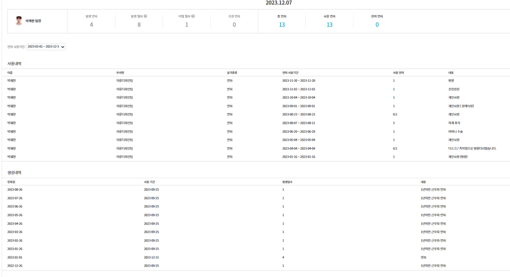 23년9월25일까지 사용할수있는연차는 13개가 발생하였습니다 현재 다사용하여 0개입니다