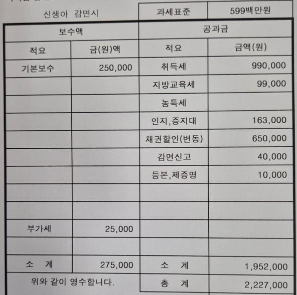 해당 영수증은 법무사가 임의로 작성한 것이기 때문에 사실관계 확인이 불가능하며 실제로 해당 지출에 대한 실물 영수증을 요청을 하셔서 금액을 정확히 확인해보셔야 하니 요청을 해보시길 바랍니다.