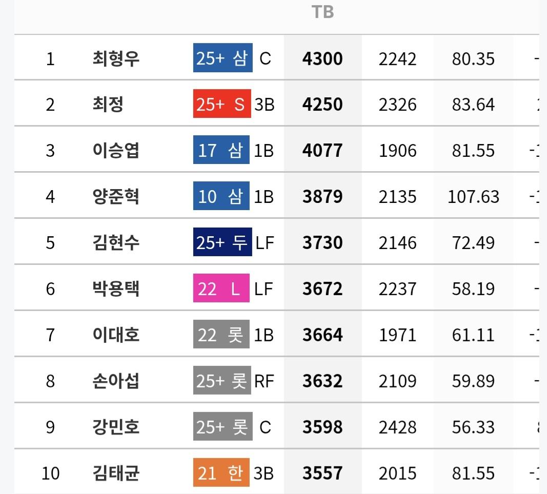 2025년 6월 11일 경기까지의 통산 루타수 1위부터 10위까지입니다.