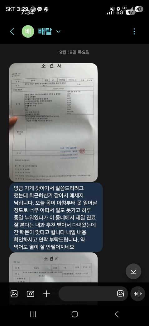 그런데 9월 17일에 또 병원을 방문하시고, 18일 새벽에 추가 병원비를 요구하는 문자를 보내셨습니다.