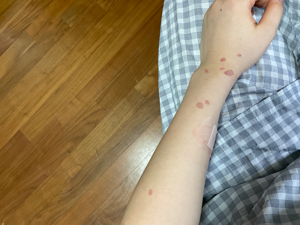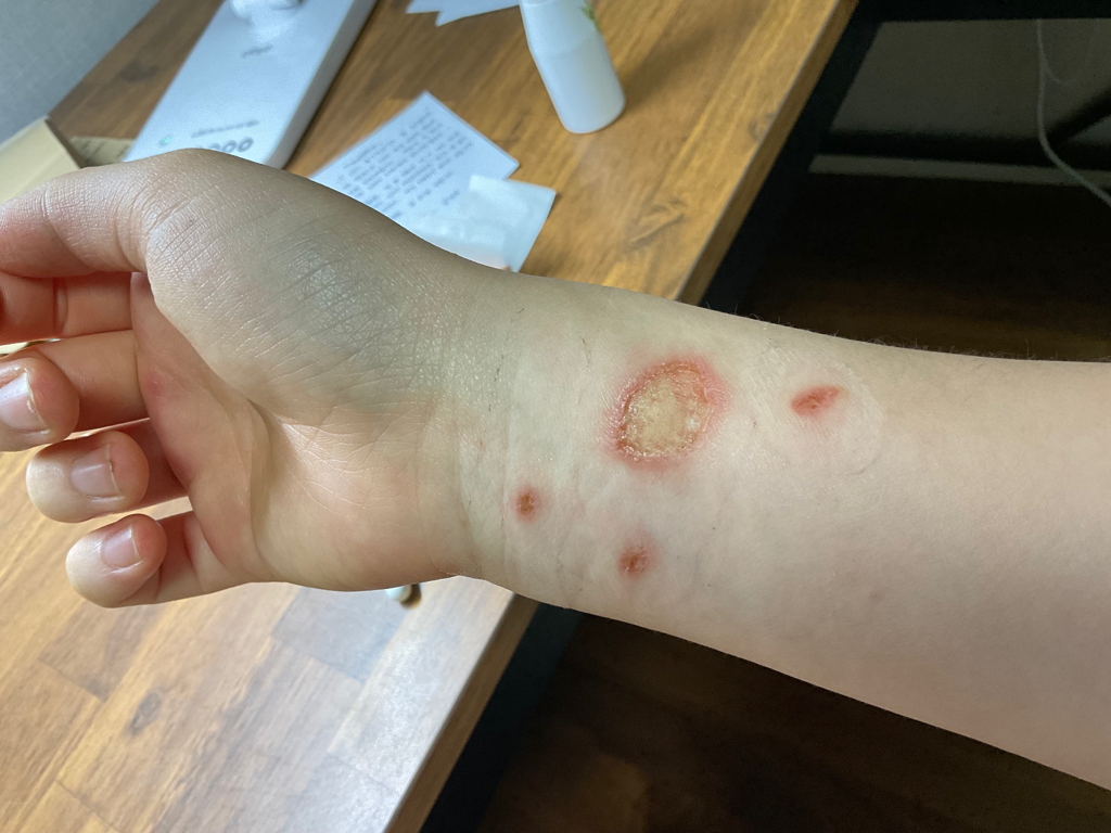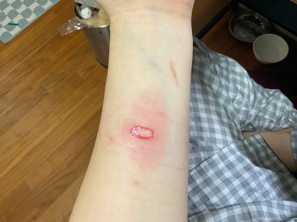첫 세 장의 사진이 화상을 입은 지 이틀정도 되었을 때 상처의 모습이고, 나머지 뒤에 네 장의 사진은 처음 다쳤을 때로부터 일주일이 지난 시점에서 다시 찍은 겁니다. 그냥 나을 때까지 밴드 붙이면서 생활하려고 했는데 주변에서 피부가 괴사할지도 모른다고 하며 병원에 가라고 하더라고요.