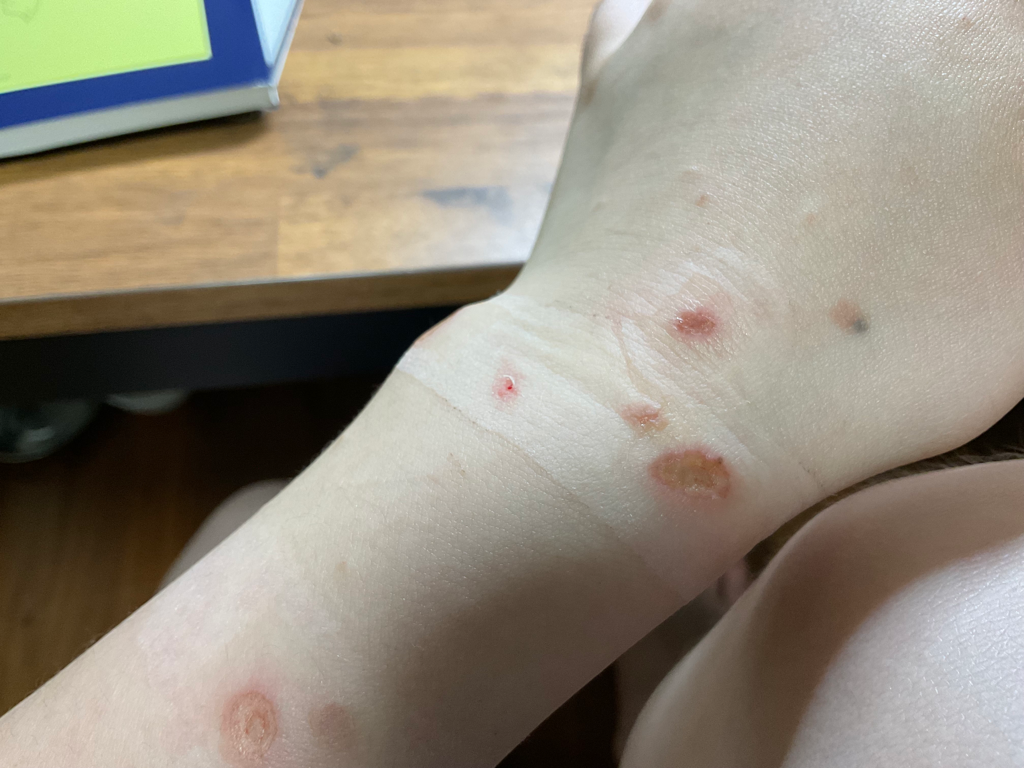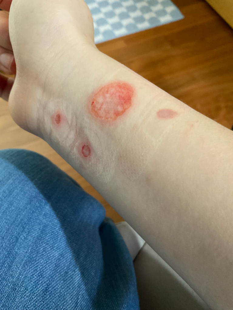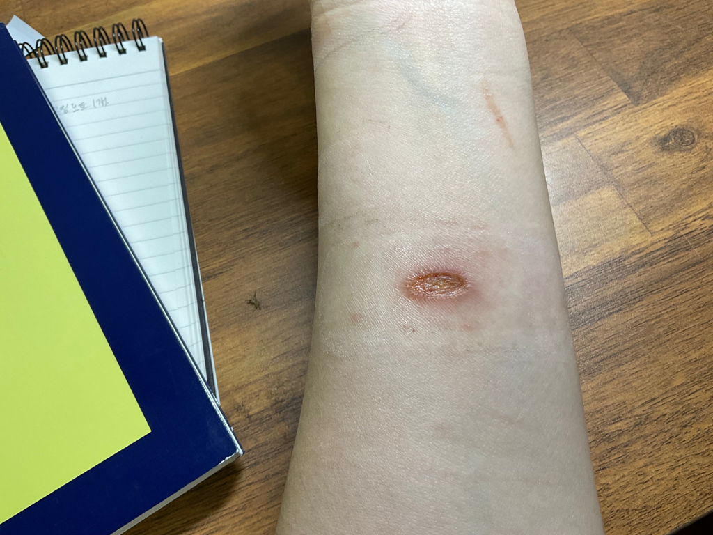 오른쪽 팔목의 화상은 좀 깊어보입니다. 소독을 잘 해야 흉터를 최소화 할수 있을 것 같습니다. 시간이 지나면 회복되기는 하겠지만 치료는 필요할것 같습니다.