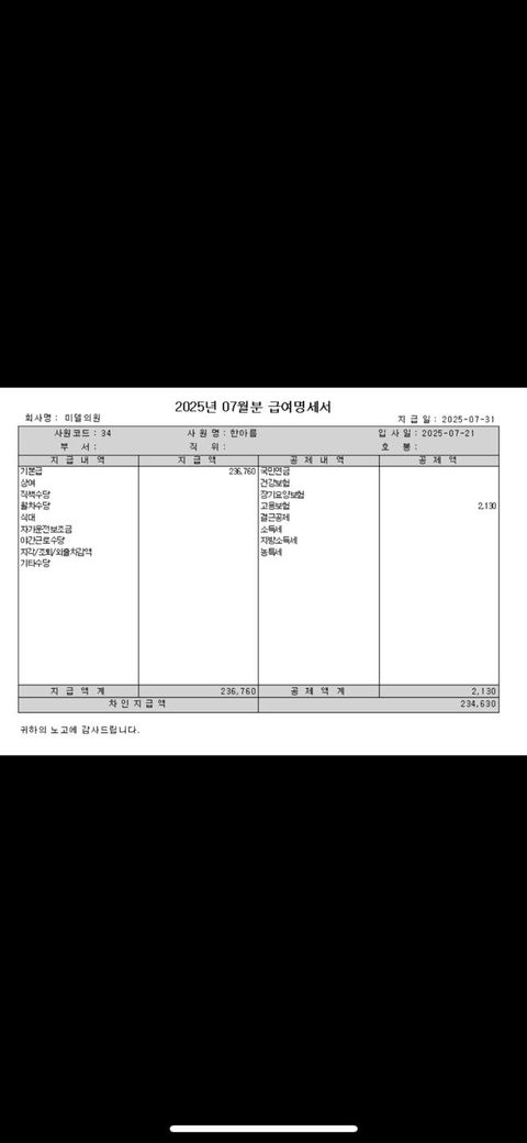 지금 급여 명세서를 받았습니다. 금액이 너무 적어 문의드려요