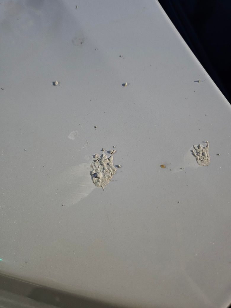 지금 사진상으로 봤을 때는 시멘트가 저렇게 튄다는게 별로 더 이해가 가지 않습니다 새똥일 가능성이 많이 있고요 새똥 같은 경우 세게 맞아서 옆으로 튀는 거 같이 보입니다 색상은 원래 쇠똥도 여러 가지 색상이 있기 때문에 새똥이 맞는 거 같네요