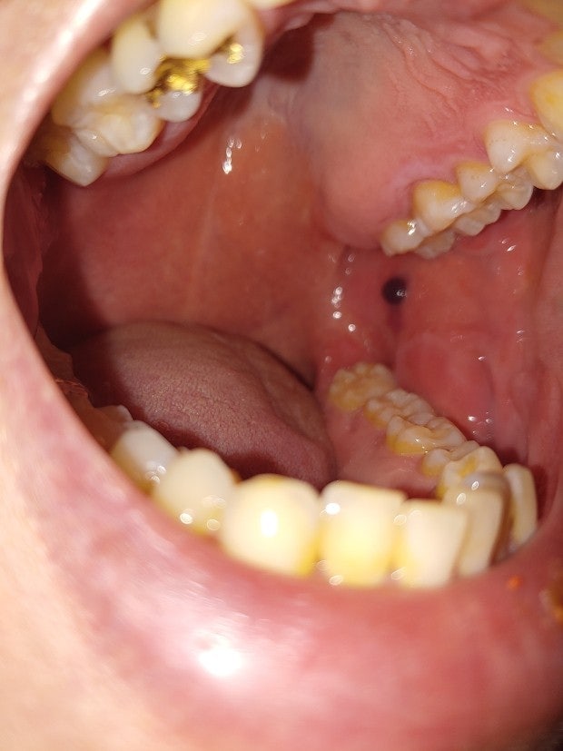 사진을 보시면 볼 안쪽에 무슨 검은 혹 같은 게 있습니다. (사진 가운데에서 약간 오른쪽 부분)