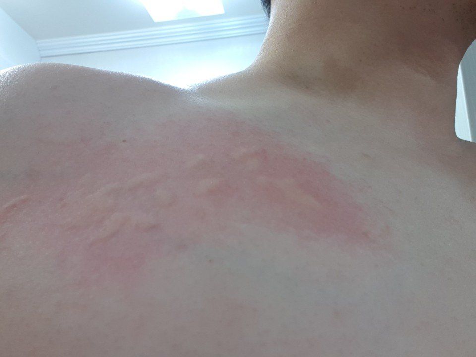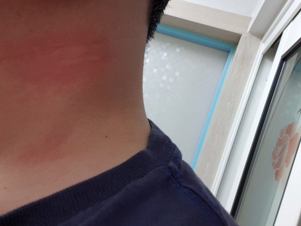 질문하신 내용에 대하여 아래와 같이 답변 드립니다.올려주신 사진에서 보면 팽진(부풀어 오른곳)과 발적(붉게 변한곳)이 보이며 소양감(간지러움)이 동반되어