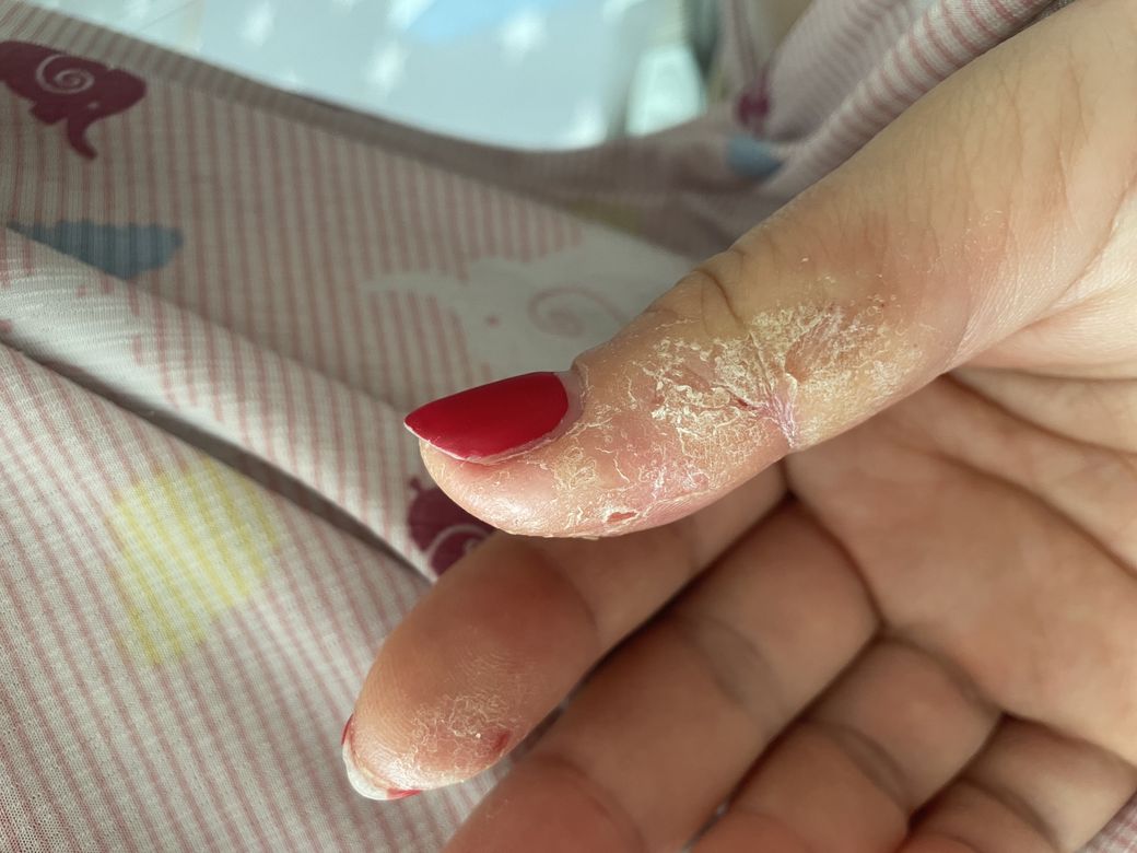 습진이 아주 심하시네요. 평소 일을 하실 때 손에 자극적인 물질을 많이 만지시나봅니다. 골무 끼는거 잘 하시는 겁니다. 최대한 자극을 줄여야하고 피부과에서 연고 처방을 바르시면서 지켜봐야 합니다. 보습제도 잘 발라야 하구요.