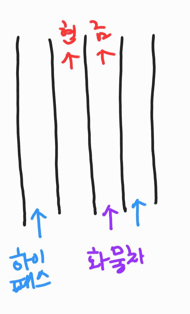 만약 하이패스차선1차선으로 들어가서 오른쪽으로 고속도로 들어가야 하는 상황에서 예기치 못한 사고가 발생할 수 있으니 이럴때는 화물차 진입차선으로 통과하여 오른쪽 고속도로로 진입하는것이 올바른 진행방법입니다.