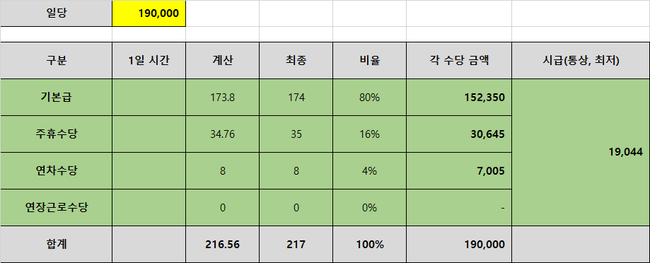 금액 : 일당 190,000 일 시 (연장은 별도 지급)