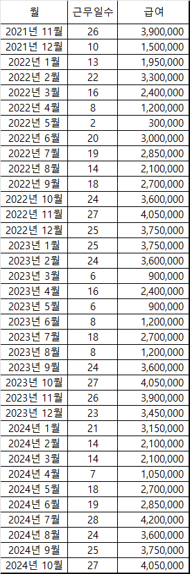 제가 계산한 내역이 맞는지 근무일수와 근무내역도 첨부드리오니 확인 후 답변 부탁드립니다.