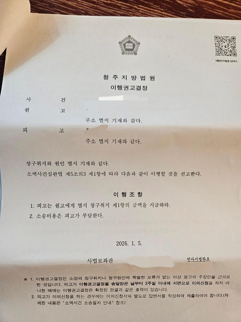 1명 평가이행권고결정문을 받고 2주간 이의가 없으면 확정판결이 됩니다. 가만히 기다리면 계좌번호가 오는 게 아니라 통장 압류(강제집행)가 들어오며, 집행 비용까지 물게 됩니다. 따라서 즉시 상대방에게 연락해 계좌를 받아 송금하거나, 연락이 안 되면 법원에 '변제공탁'을 해야 합니다.