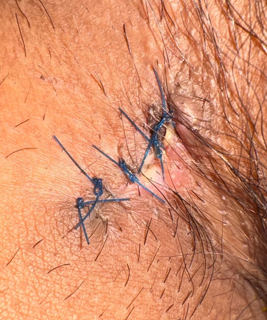 사진의 소견을 통해서 보았을 때에는 딱히 감염 및 그로 인한 염증 등 소견이 의심스럽거나 하지는 않습니다. 아직 봉합 후 기간이 얼마 되지 않았고 봉합사를 제거하지 않았을 정도의 상황이라면 누르면 아픈 증상이 자연스럽게 동반될 수 있습니다.