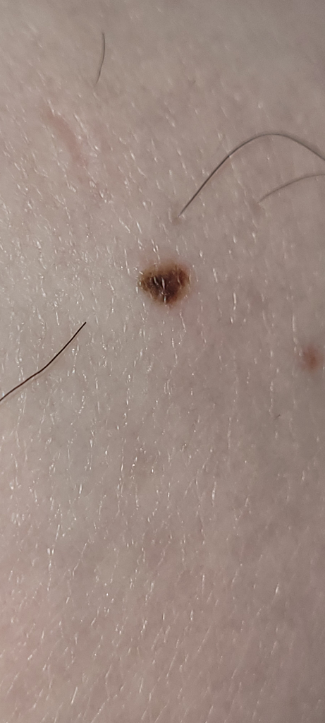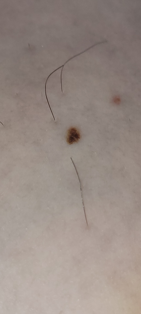 사진 소견을 통해 볼 때에 경계가 분명하며 모양이 찌그러져 있지 않고 튀어나오거나 한 소견이 보이지 않아 흑색종의 가능성은 낮아 보입니다. 하지만 확실하게 감별하기 위해서는 피부과에서 조직 검사를 받아보아야 하겠습니다.