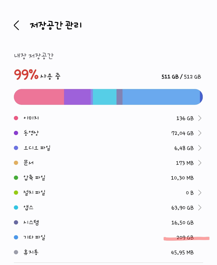 제가 사진을 많이 가지고 있기는 하지만 기타파일 용량이 비정상적으로 계속늘어납니다... 사진 영상을 지워도 몇시간 안지나서 다시 용량이 꽉 차구요...ㅠ 카카오 캐시파일도 다 지우고 했는데도 그러네요... 용량이 다차면 폰도 뜨거원지고 톡도 잘 안되고 모든 어플이 엄청 버벅 거립니다ㅜㅜ 도대체 왜 용량이 계속 늘어나는 걸까요ㅜㅜㅜ