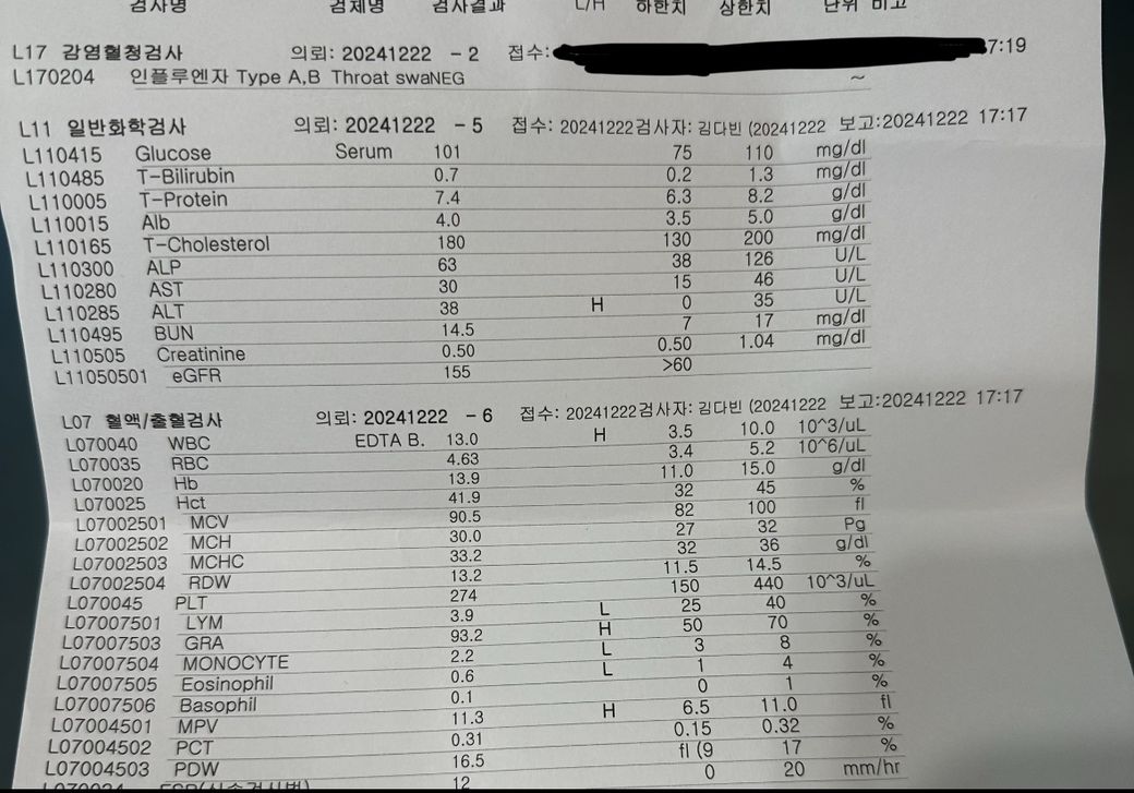 현재 올려주신 사진에서 WBC라고 하는 것이 백혈구에 대한 수치인데, 백혈구는 우리 몸에서 면역을 담당하고 있습니다. 백혈구 수치가 정상보다 높아진 것으로 보아 면역작용이 많이 일어나고 있다는 뜻이고 이는 염증 소견이 있음을 시사합니다.