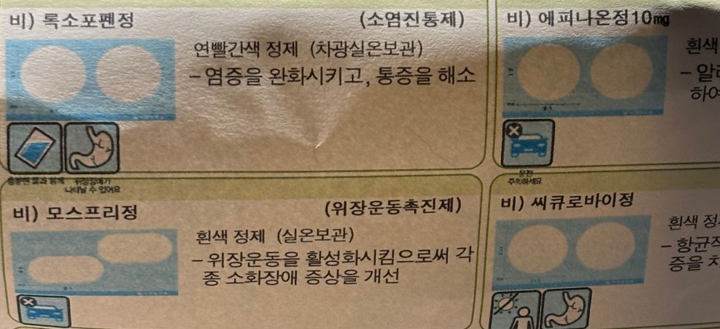 문의주신 사진의 약들중에 허리약에서 에페신에이스정과 성형외과약에서 록소포펜정이 중복이 되기에두가지중 한가지는 빼고 복용하길 권장드립니다. 나머지 약들은 함께 복용을 하셔도 괜찮습니다.