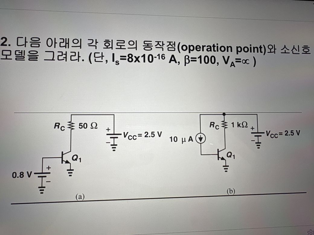 다음 아래의 각 회로의 동작점과 소신호 모델을 그려주세요. 자세한 문제는 사진 참고 부탁드립니다!!!!!!