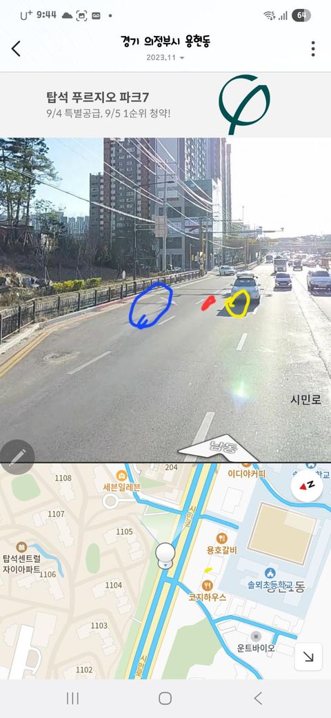상황은 파란색 둥그라미에 벤츠가 있었고 제가 벤츠 운전자석 거의 통과다할때쯤 벤츠차주인 아주머니가 문을 벌컥 열어 자전거는 대각선 방향으로 약간 들리면서 저기 노랑색 둥그라미 동일차로에서 제 뒤쪽으로 오던 카니발의 뒷좌석 창문쪽을 쳐서 흠집이 났습니다 카니발 차주는 별일 아니기에 그냥 가셨고요