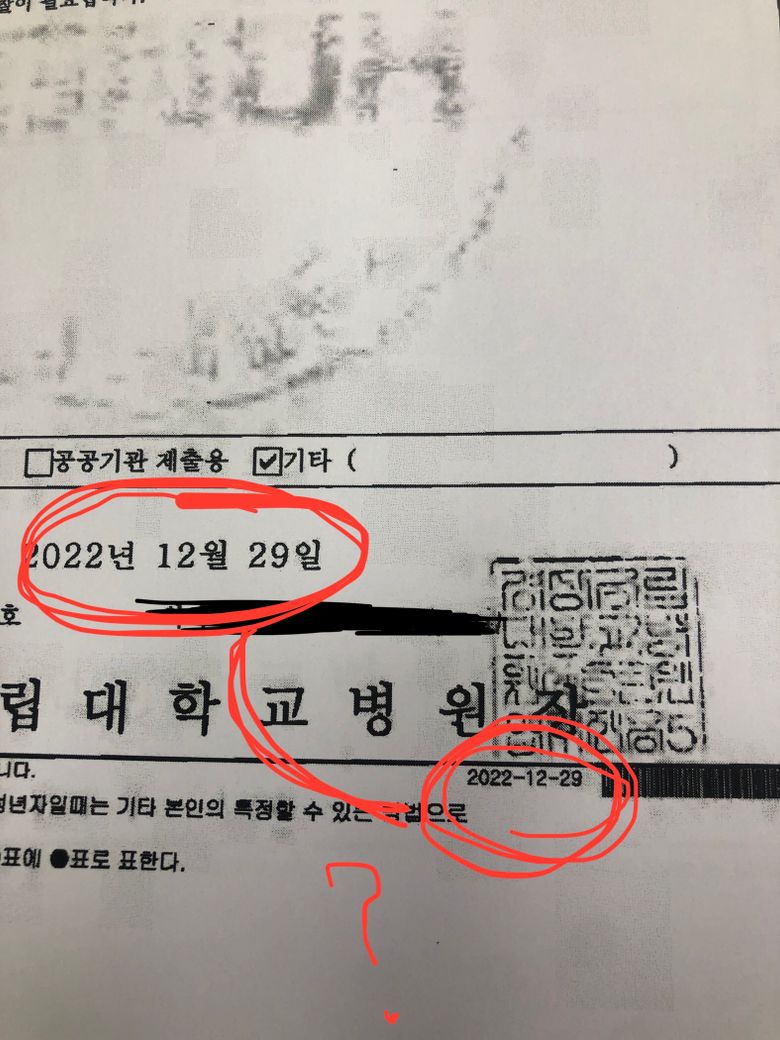 진단서 우측 하단에 적혀 있는 일자는 보통 진단서가 발급된 날짜를 의미합니다. 이는 병원에서 진단서가 전산상으로 출력될 때 기록되는 날짜로, 발행일과 다를 수 있습니다. 예를 들어, 진단서를 처음 발급받고 나중에 재발급을 요청할 경우 재발급 날짜가 하단에 표기될 수 있습니다.