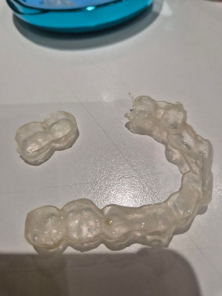 인비전 라인 교정 장치는 얇은 재료를 이용해서 치아를 이동시키는 방법입니다. 두께가 얇기 때문에 교합력이 너무 강하면 깨질 수도 있습니다. 깨졌을 경우 다시 붙여서 사용하는 건 의미가 없으며 다시 제작을 해서 부착을 해야 합니다